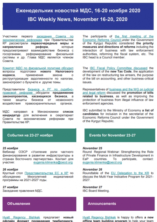 Бир жумада болуп өткөн окуялардын маалыматтарын жана дагы келе жаткан бир жуманын алдын ала жарыяларды жана окуяларды камтып турган Эл аралык ишкерлер кеӊешинин Жумалыгы (дайджест) 2008 жылдын октябрь айындан баштап иштеп чыгарылат. Дайджест Эл аралык ишкерлер кеӊешинин бардык мүчөлөрүнө электрондук дарек аркылуу жөнөтүлөт. Эл аралык ишкерлер кеӊешинин мүчөлөрү выпускта көрсөтүлгөн окуялардын жана иш-чаралардын маалыматтарын деталдоосу үчүн суроолорун жиберүүсү мүмкүн. Эл аралык ишкерлер кеӊеши Жумалыкты болочок иш-чараларды жана демилгелерди жарык кылуу үчүн жакшы аспап деп эсептейт.