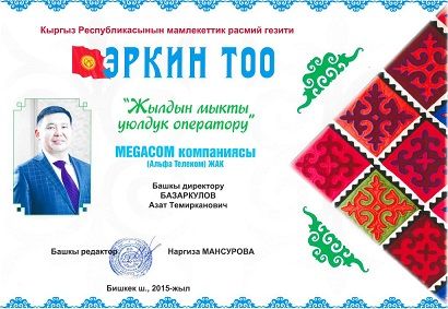 Накануне празднования Нового 2016 года республиканская газета «Эркин Тоо» подвела итоги за 2015 год, выбрав лучших из лучших в своих сферах деятельности. В числе 60 выдающихся руководителей, управленцев и знаменитостей лучшим назван отечественный мобильный оператор, компания MegaCom под руководством Азата Базаркулова. На страницах итогового выпуска издания лучший мобильный оператор года по версии газеты «Эркин Тоо» подвел итоги деятельности за 2015 год, продемонстрировав высокие показатели по ключевым направлениям: выручке, росту абонентской базы, техническому развитию. Ознакомиться полностью с отчетом оператора, подытоживающим уходящий год, можно также на официальном сайте компании.
