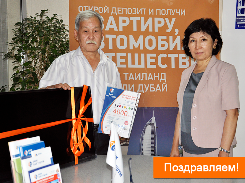 А это значит, что каждый клиент, который открывает накопительный депозит «Бай-Тушум» и пользуется другими услугами банка, может получить не только качественный сервис, но и ценные подарки: сертификаты на бытовую технику, путешествие на двоих в Дубай или Таиланд, и даже квартиру в Бишкеке!