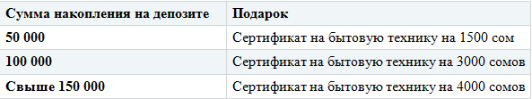 Можно отказаться от минимального гарантированного подарка, Продолжить участвовать в Акции, Увеличить размер депозита до 100 тыс. сом и более и Получить подарочный сертификат на сумму 3000 и 4000 сомов.